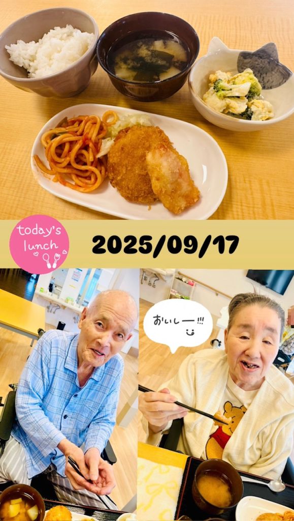 本日のお昼ご飯はカニクリームコロッケとハムカツとナポリタンとコンソメスープとミモザサラダになります✨